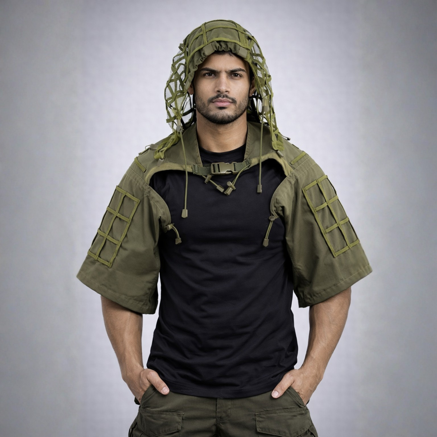 The adjustable Viper Hood features multiple sizing adjustments and straps, ensuring a secure and comfortable fit for most users while allowing full head mobility and effective concealment. Extensive external strapping across the entire ghillie foundation enables easy attachment of burlap, jute, natural vegetation, or synthetic camouflage materials, allowing users to customize camouflage based on mission environment.